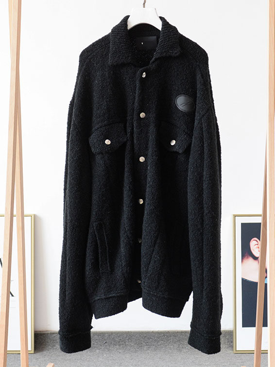 高端外贸 折 圈圈毛超长袖宽松帅气LOGO羊毛针织夹克外套毛衣黑色