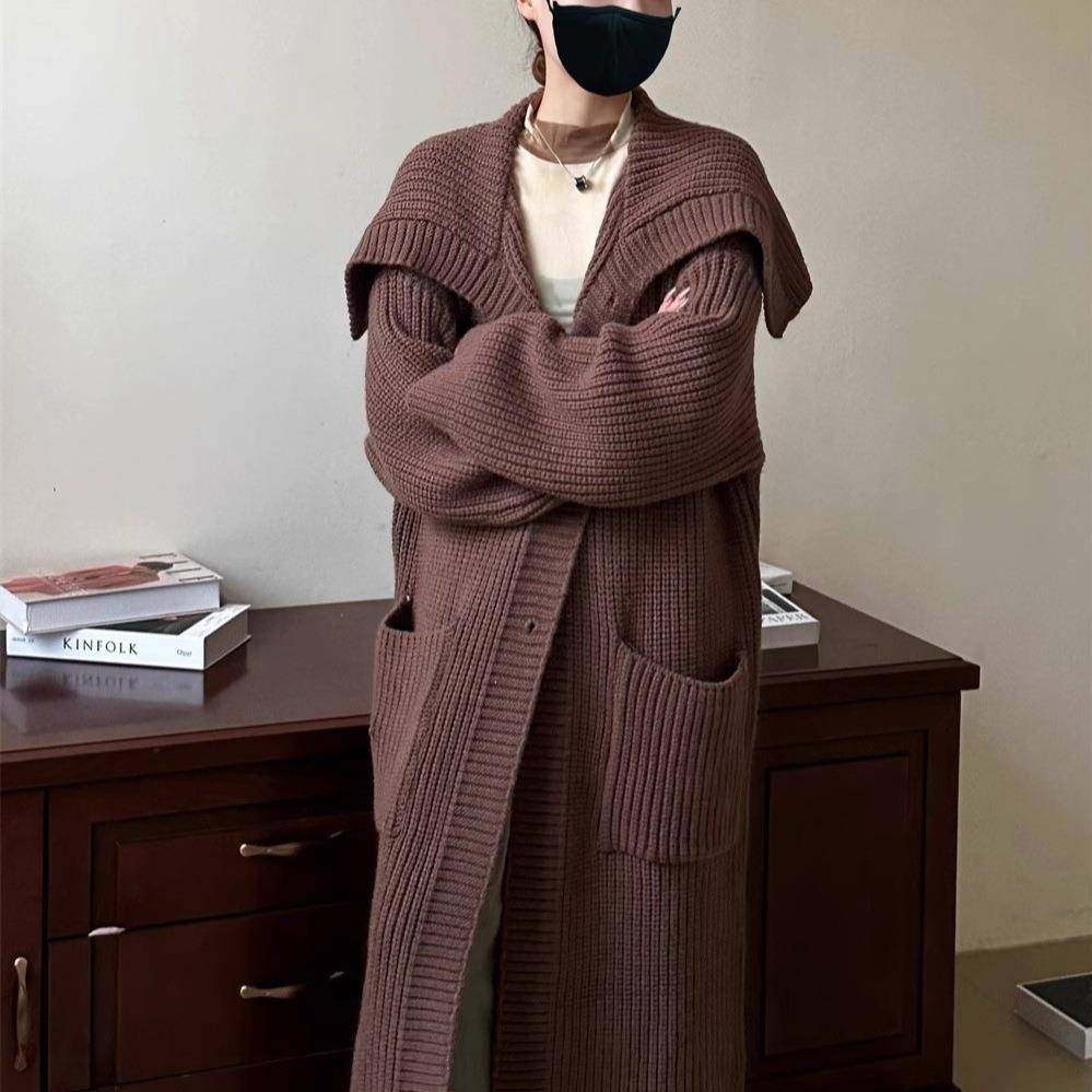 原版超长款翻领毛衣外套女秋冬慵懒风宽松气质加厚中长款针织开衫