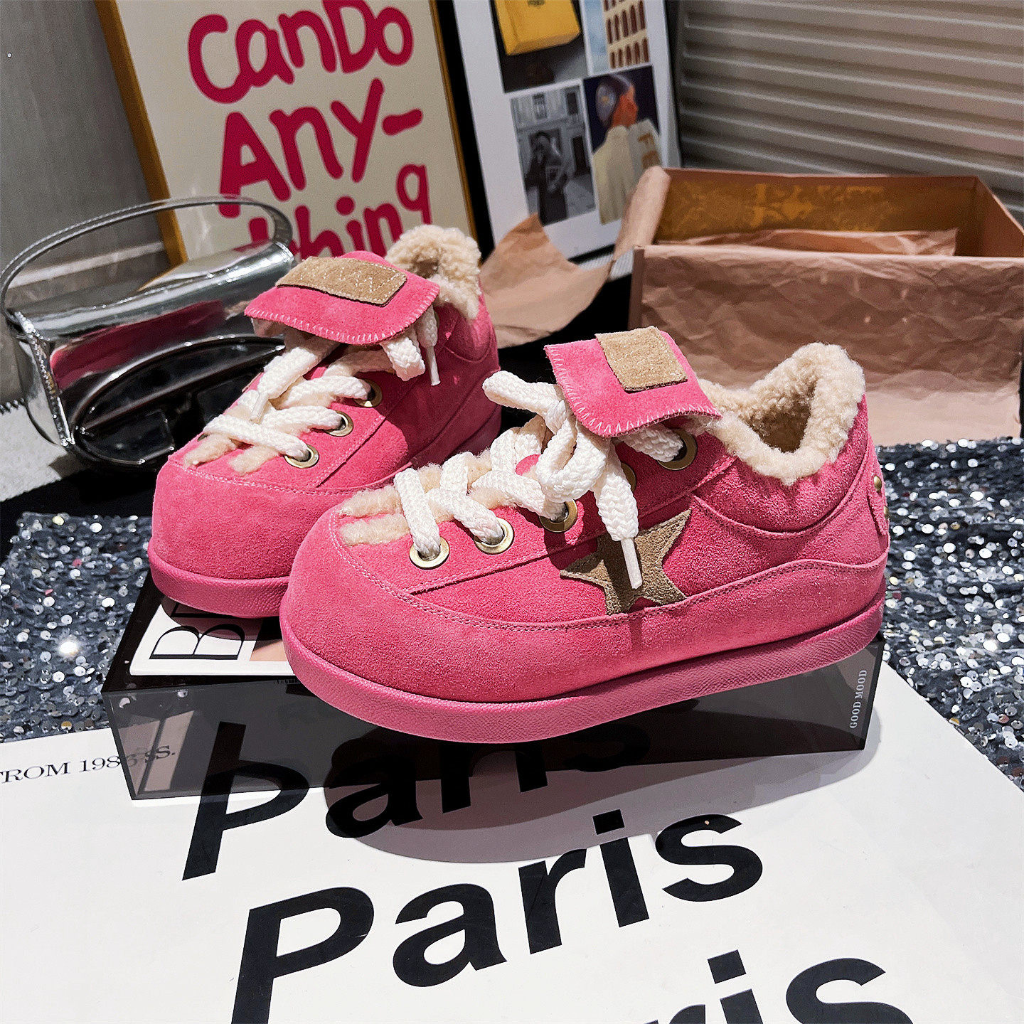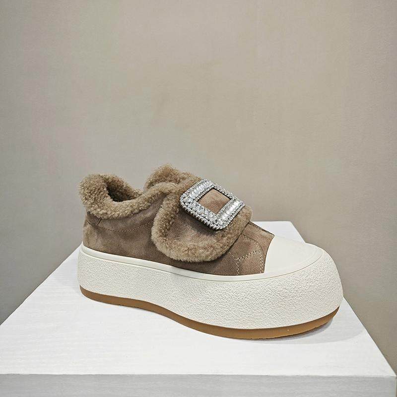 欧洲站2025冬新款水钻方扣毛毛鞋保暖羊毛加绒棉鞋厚底休闲板鞋女