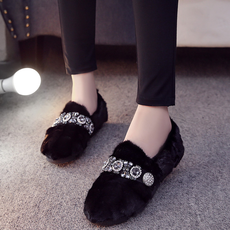 秋冬2025新款真皮水貂毛加绒厚底毛毛女鞋水钻欧洲站外穿豆豆棉瓢
