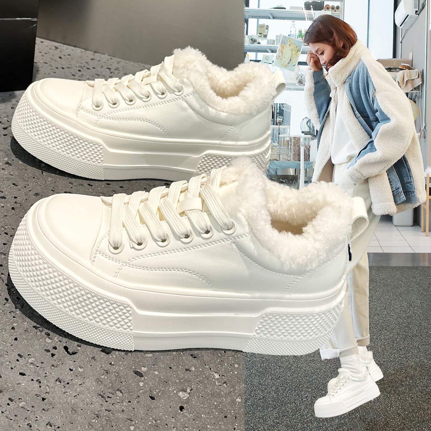 欧洲站保暖真皮小白鞋女2025冬季新款加绒毛毛鞋外穿厚底休闲板鞋