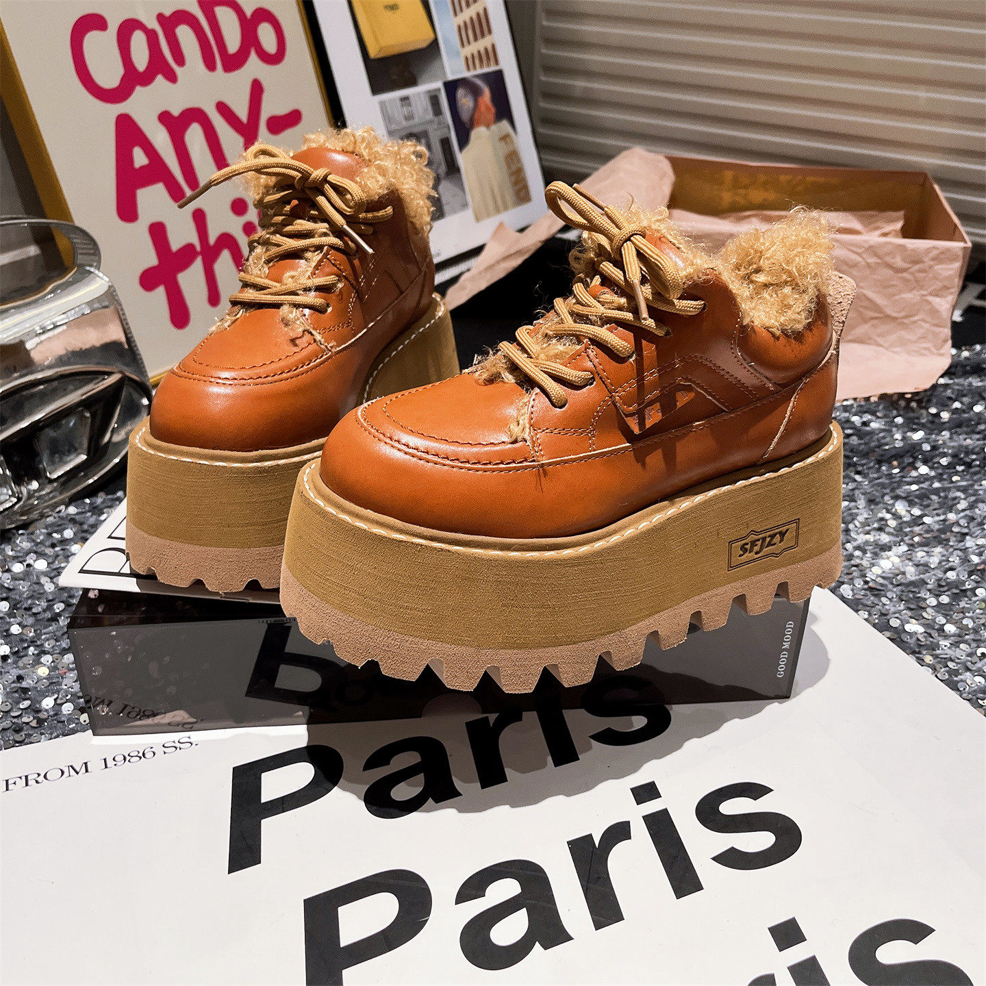 欧洲站大头字母JK小皮鞋厚底松糕系带毛呢毛毛鞋乐福鞋小个子女鞋