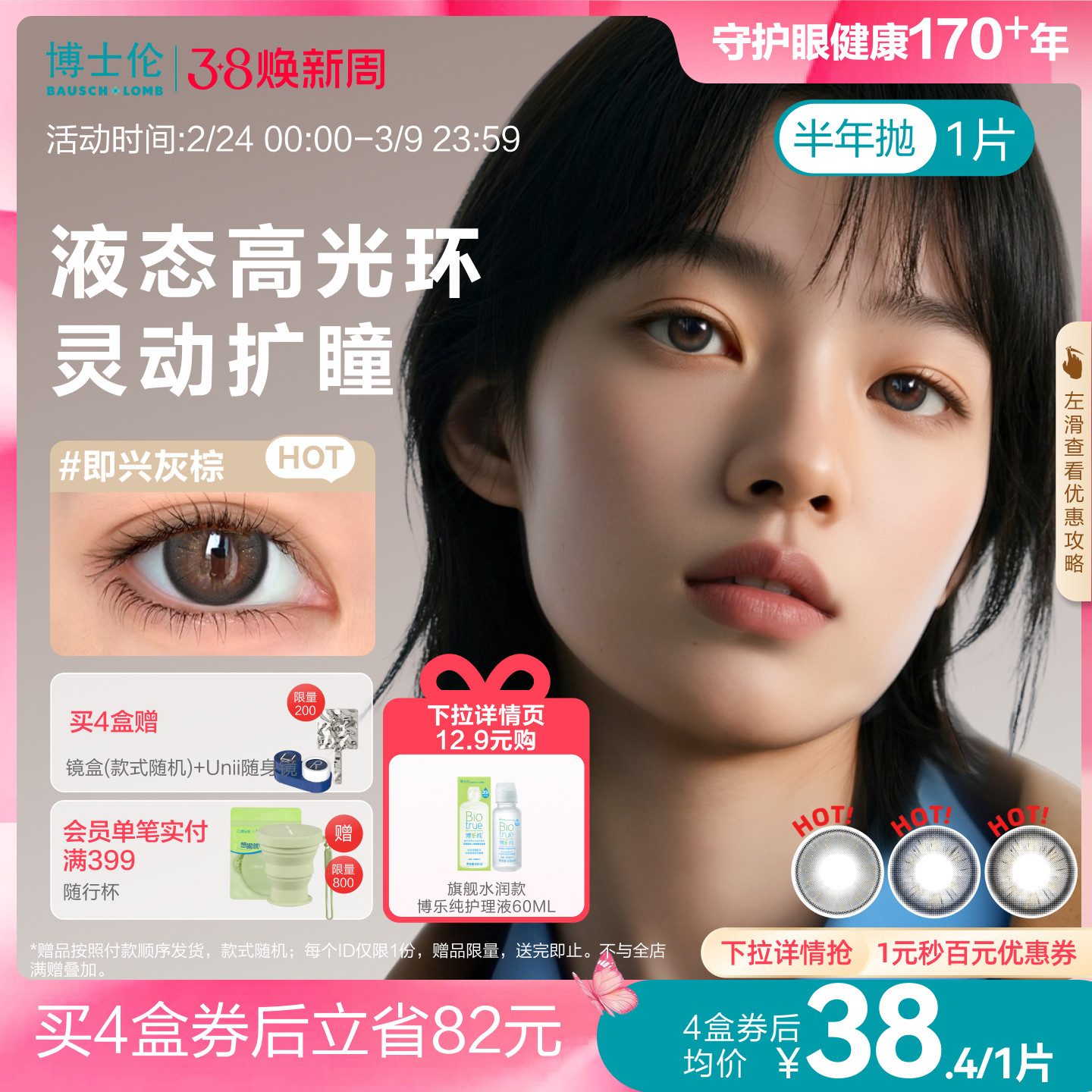 [花色上新]博士伦美瞳半年抛1片万花瞳彩色隐形近视眼镜大小直径