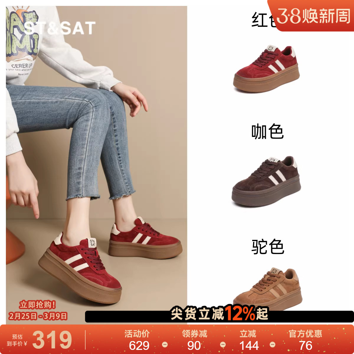 星期六红色德训鞋女小个子厚底高跟运动鞋秋冬女士真皮丑萌平板鞋