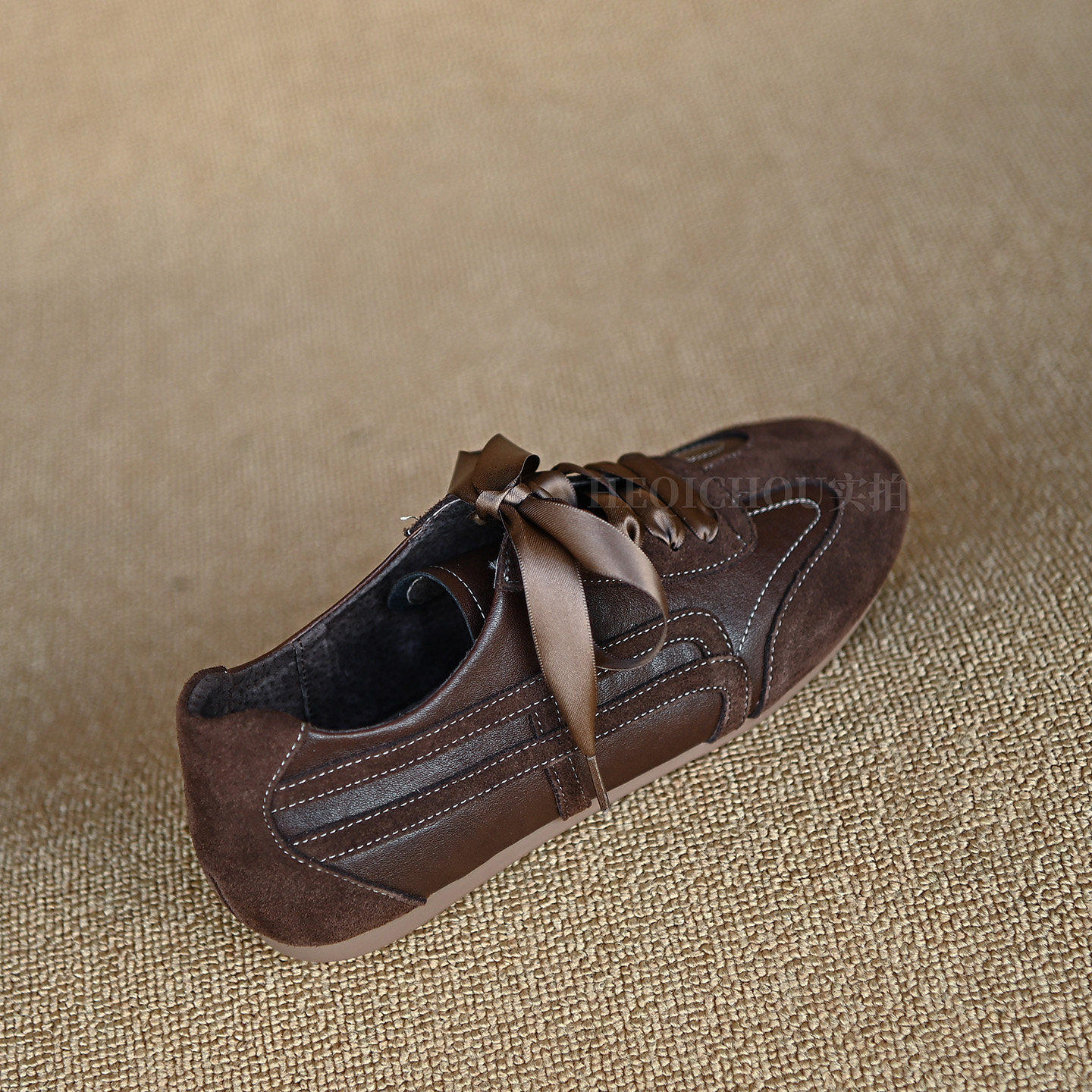 何其丑牛皮深咖色时尚休闲运动鞋女2026新款真皮德训鞋女平板鞋