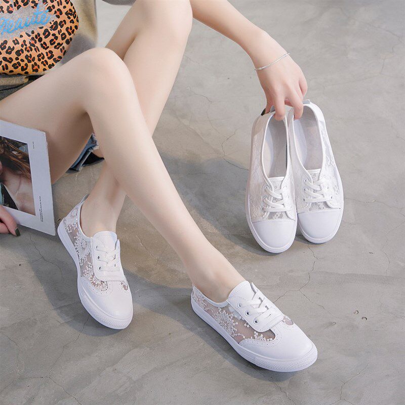 夏季浅口小白鞋女真皮2021新款洋气百搭蕾丝网面透气休闲鞋平板鞋