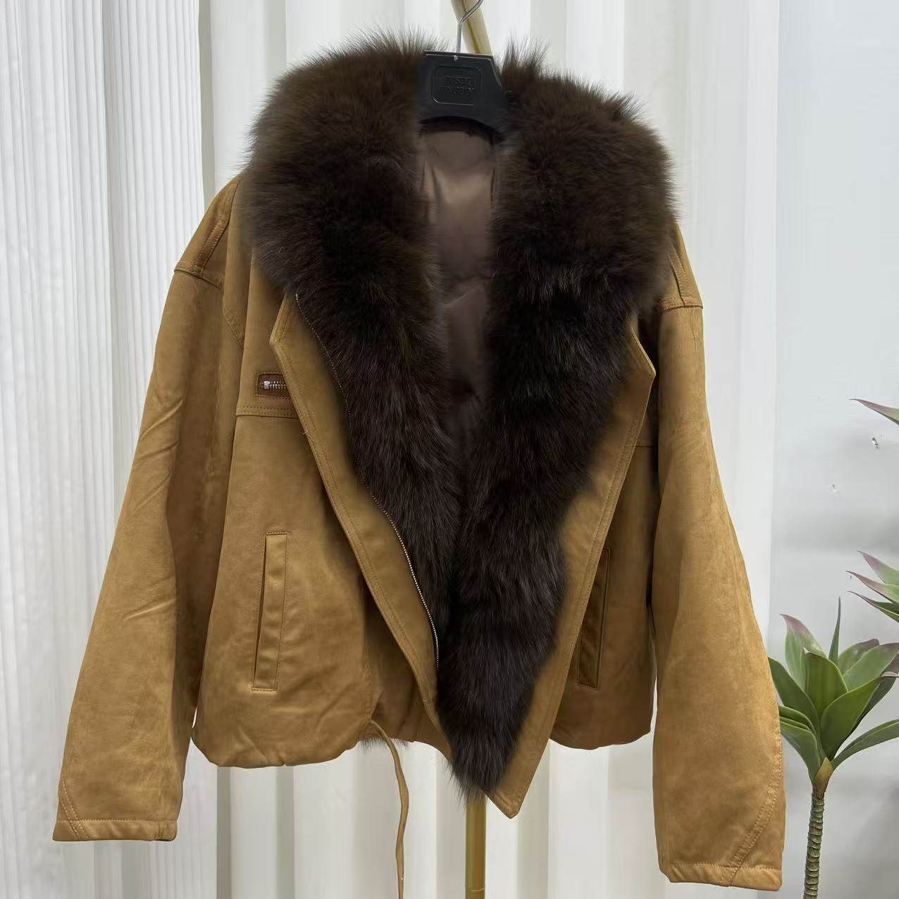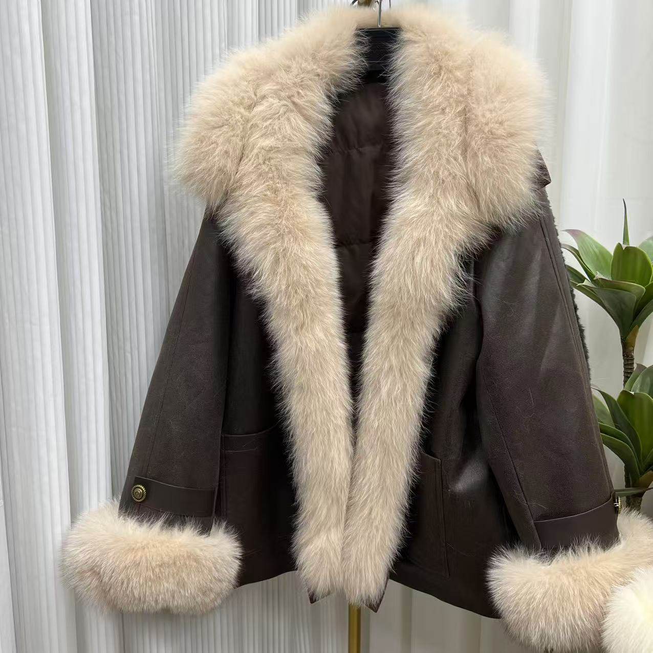 海宁皮衣短款女2025新款羽绒棉服PU皮仿狐狸毛领宽松皮草加厚外套