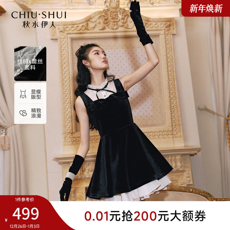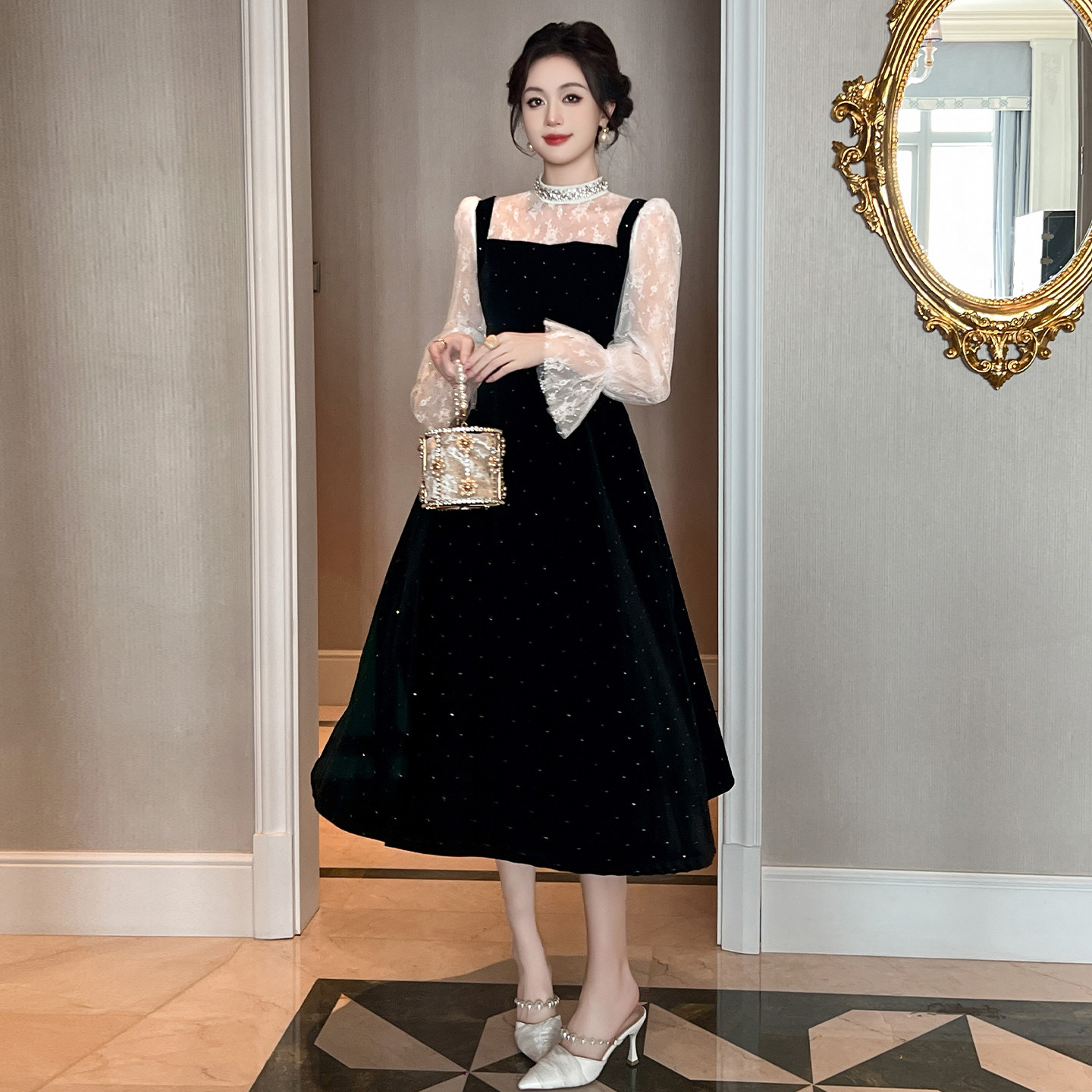 - 金丝绒蕾丝连衣裙