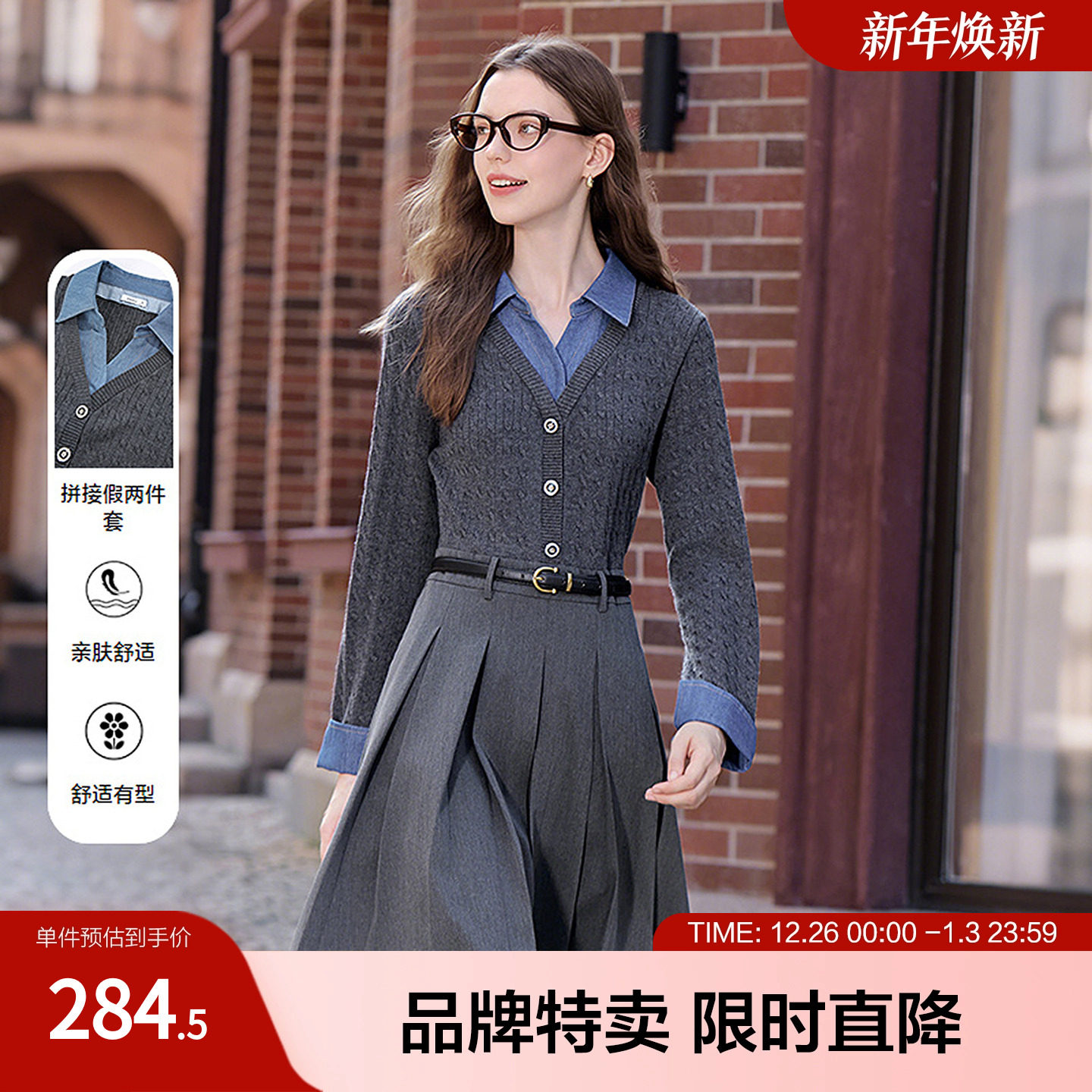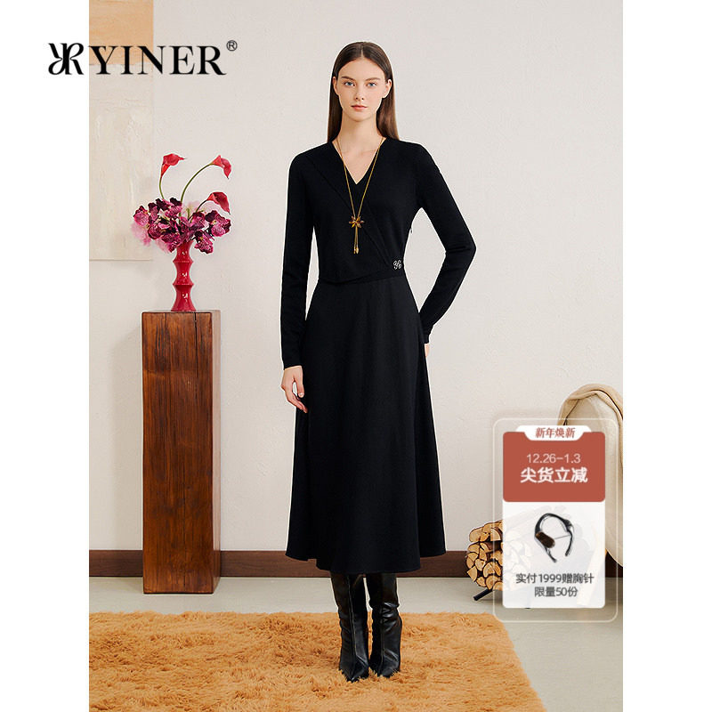 YINER音儿2025冬季新款V领美丽诺羊毛混纺针织拼接假两件连衣裙