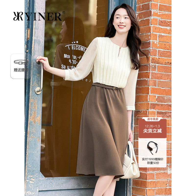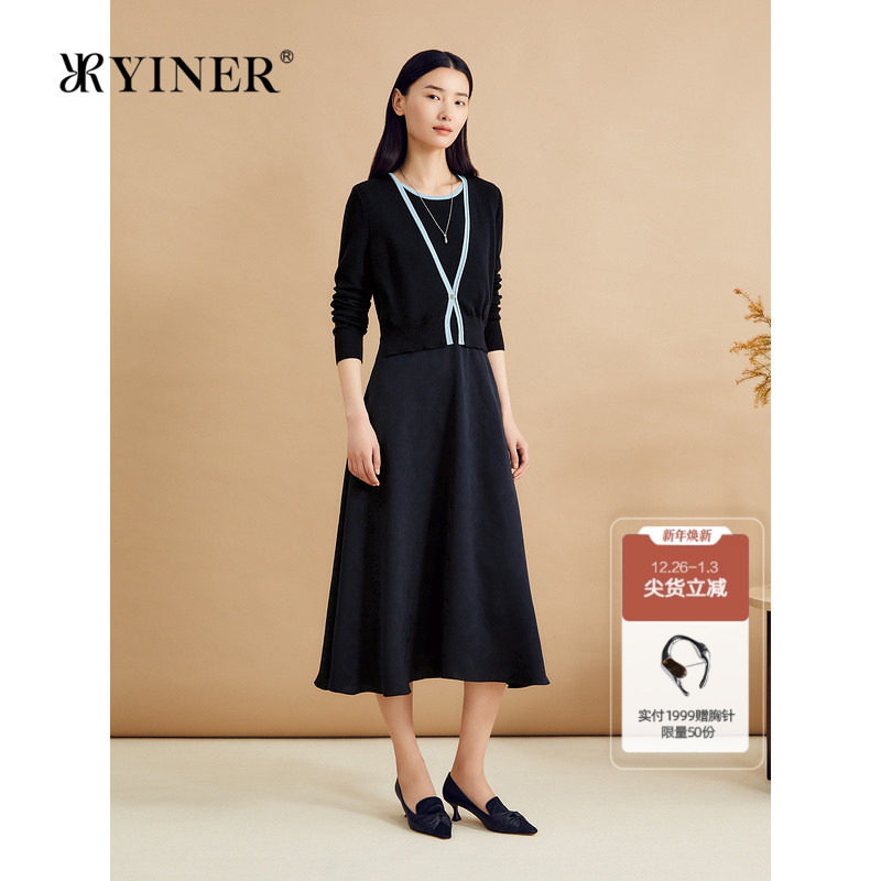 YINER音儿女装秋季法式美丽诺羊毛混纺针织拼接假两件连衣裙