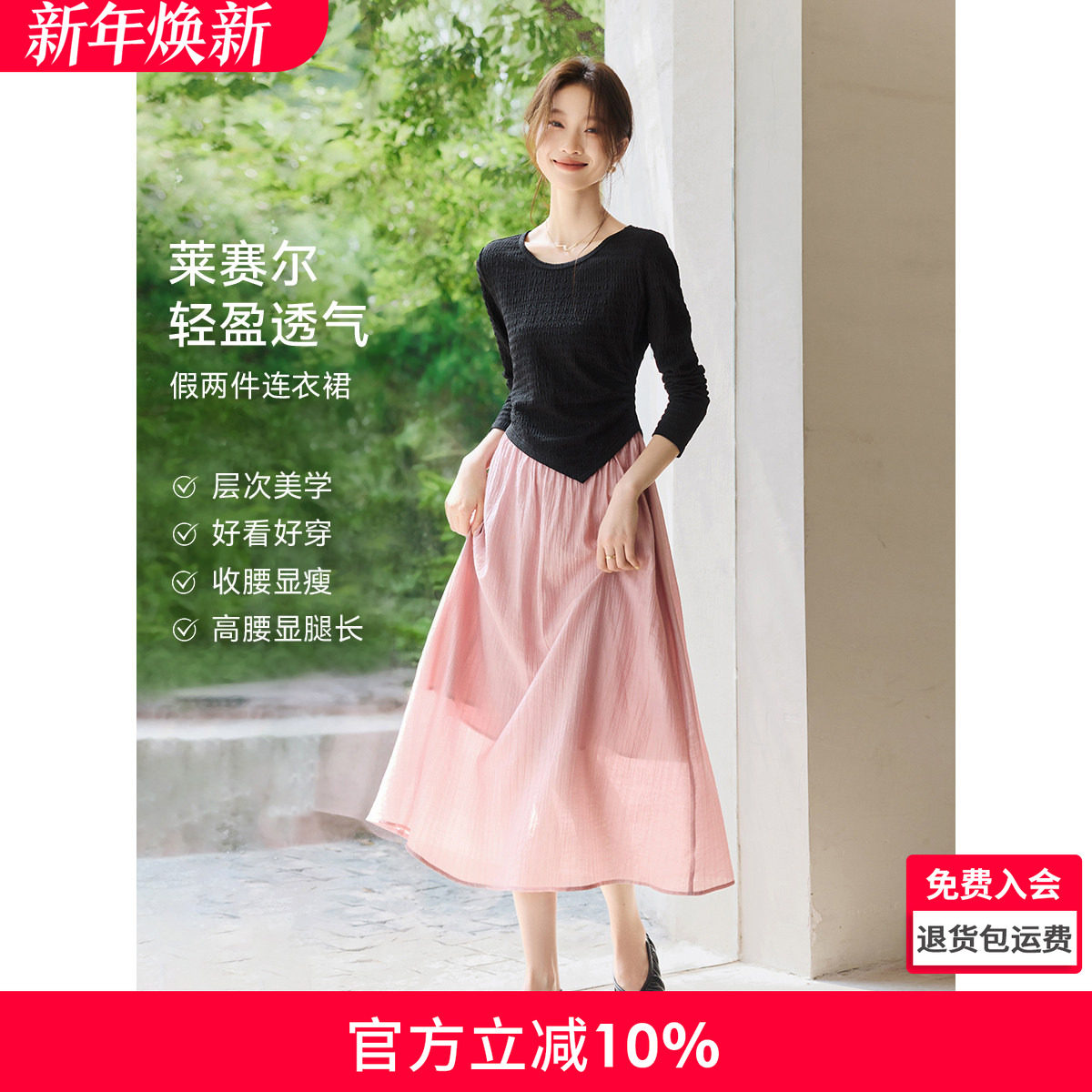 欧货拼色织带上衣拼接假两件连衣裙女春季2025新款气质中长款裙子