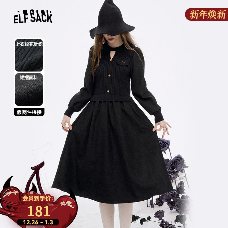 妖精的口袋针织拼接假两件连衣裙女2025年冬季新款新年穿搭小黑裙