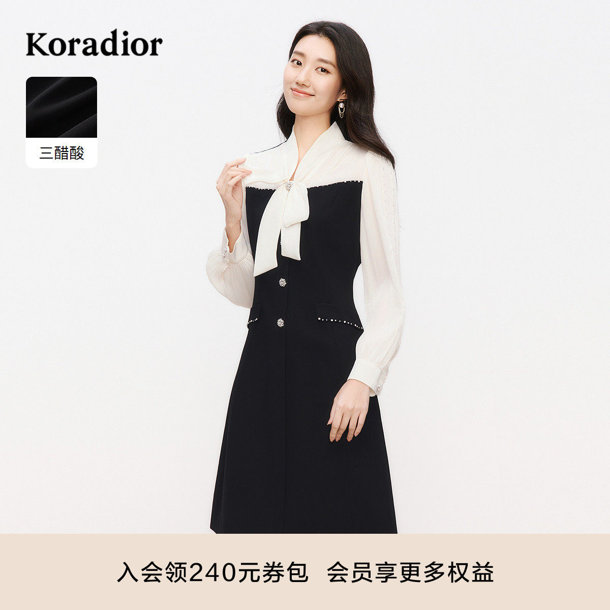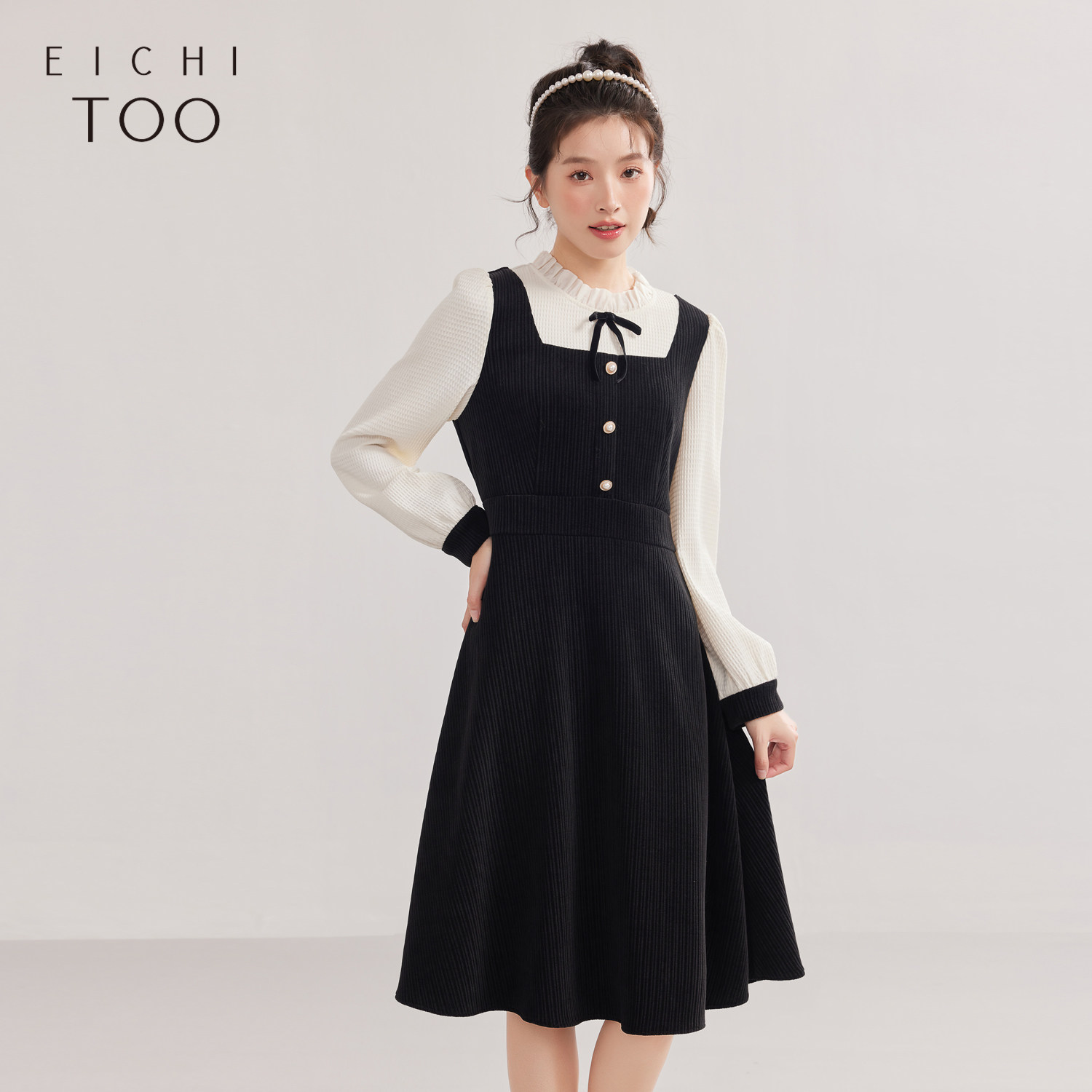 Even一雯【格雷千金】韩系高智感千金感修身假两件拼接长袖连衣裙