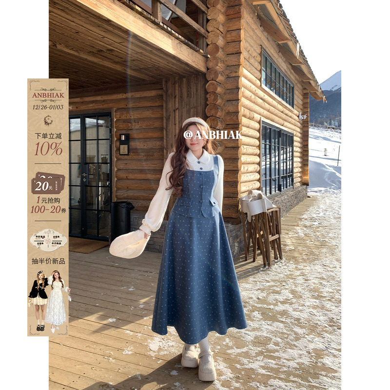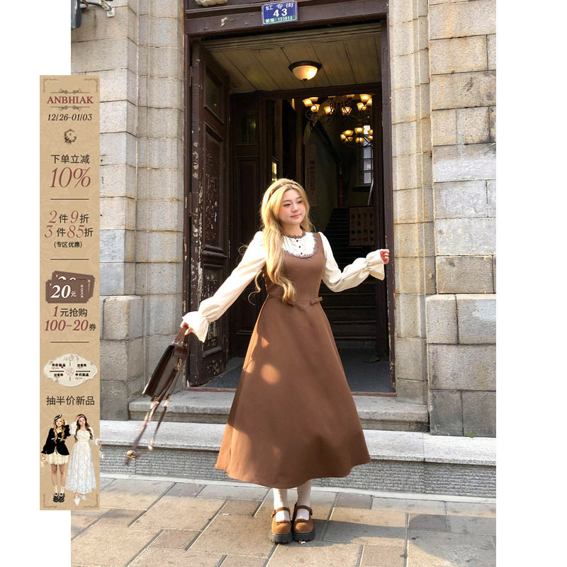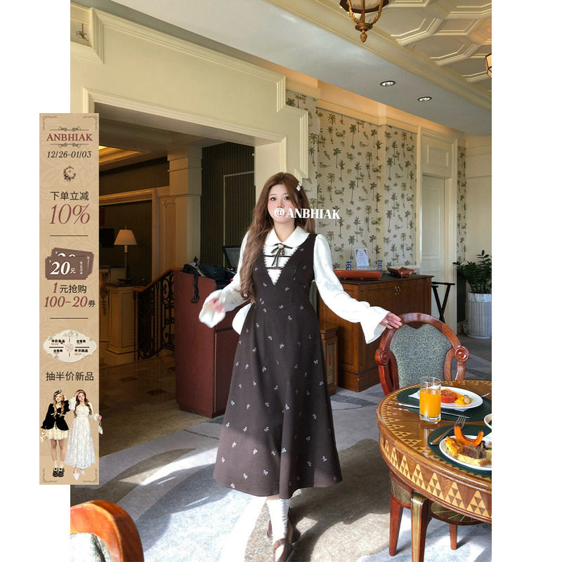 安妮不火赫本风拼接连衣裙女2025秋冬新款微胖大码小众假两件裙子