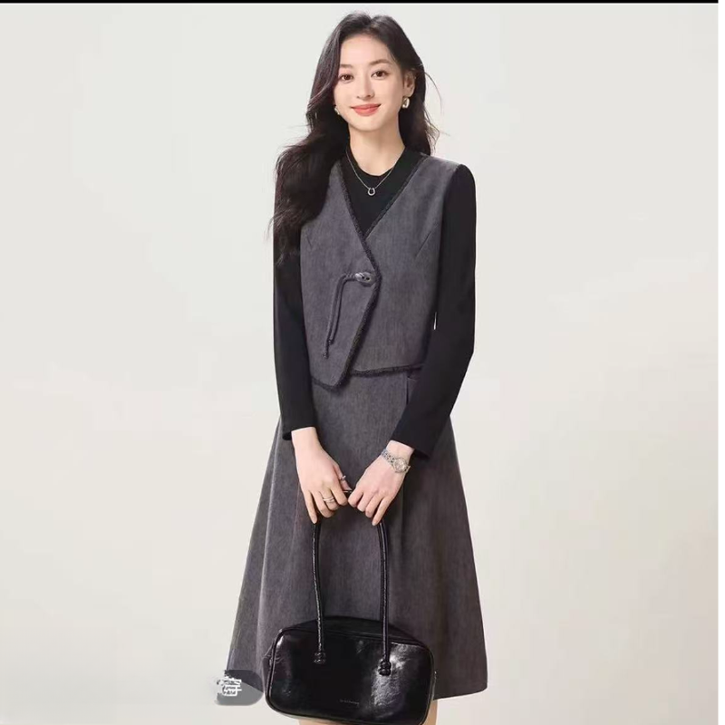 慕兔韩系灰色拼接假两件连衣裙女2025冬季新款高级感收腰a字裙子
