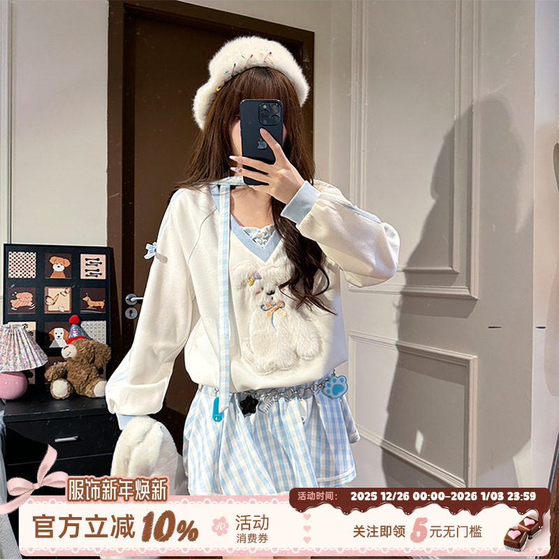 织物猪 布雷奶芙 甜美风拼接假两件连衣裙女早秋可爱连帽卫衣短裙