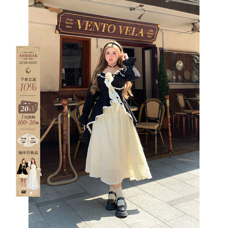 JIUYUEDI九月底法式赫本风黑白拼接假两件连衣裙女收腰显瘦长裙