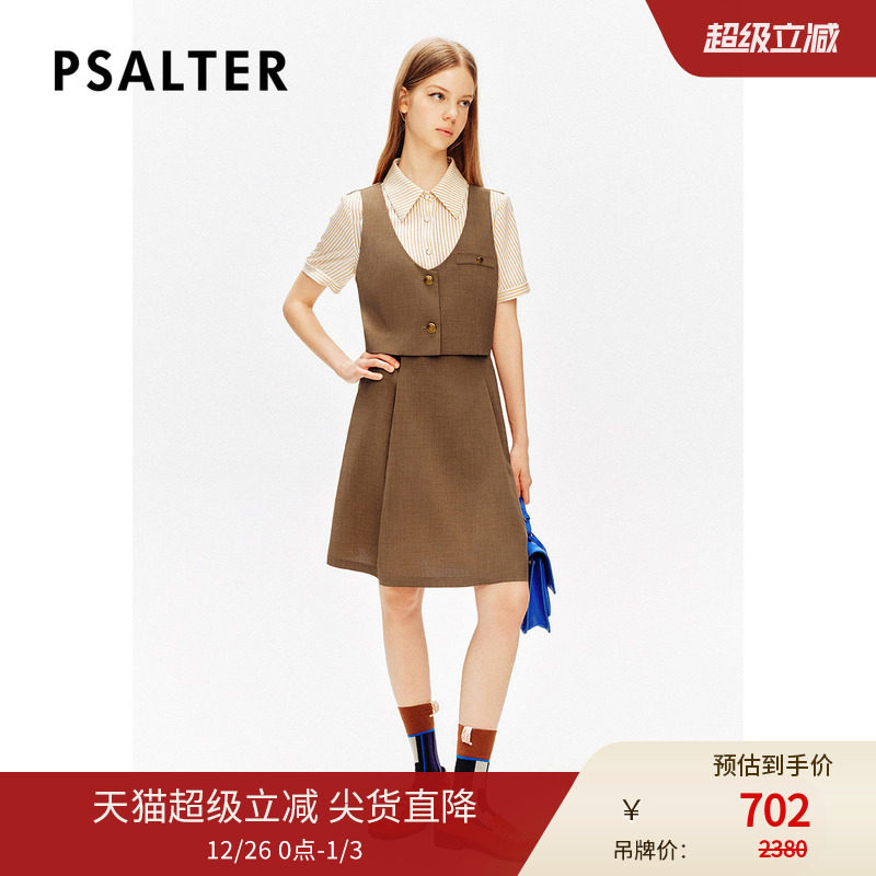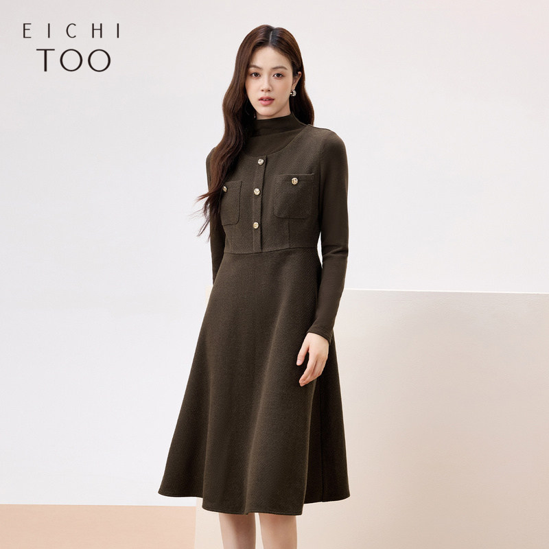 Even一雯【落日粉黛】韩系高智感秋冬假两件撞色拼接咖色连衣裙