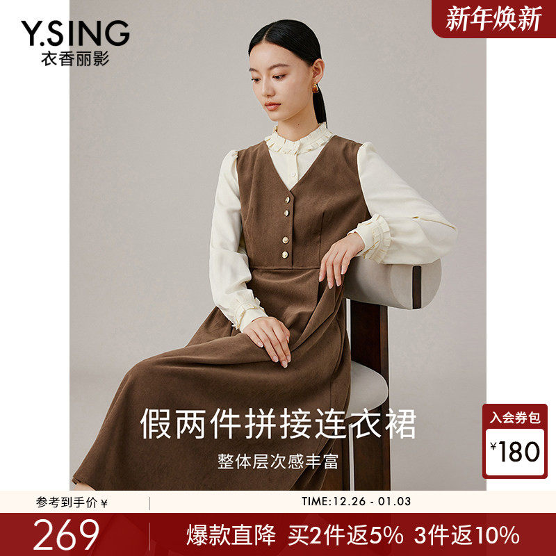 衣香丽影拼接假两件连衣裙女2025年秋冬装新款磨毛灯芯绒法式裙子