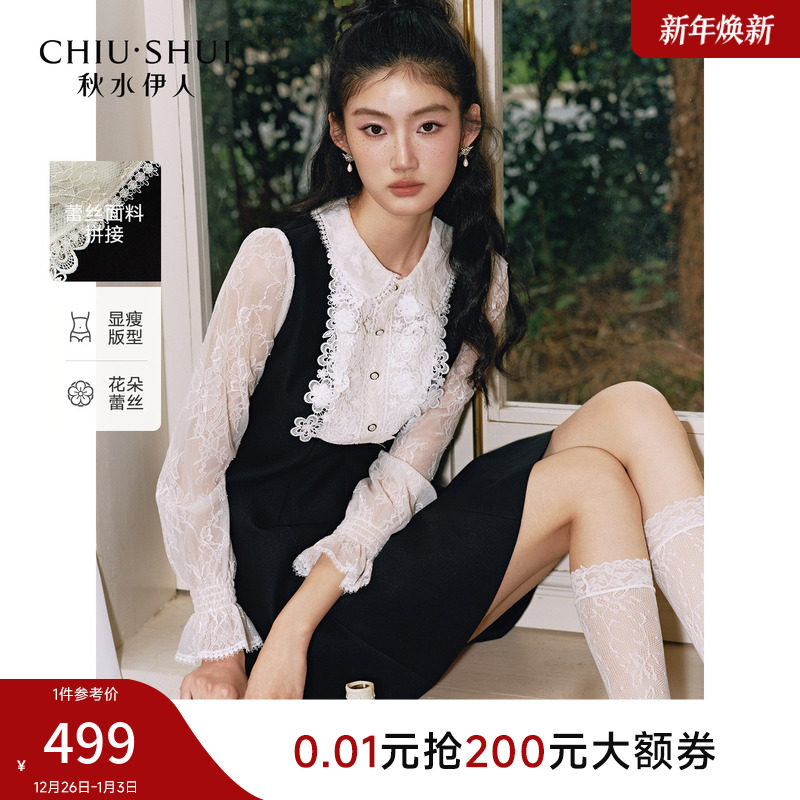 秋水伊人时尚蕾丝拼接假两件连衣裙2026年春季新款气质娃娃领裙子