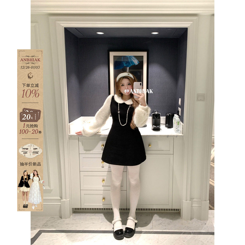 安妮不火 假两件毛绒针织拼接呢料连衣裙女微胖大码灯笼袖背带裙