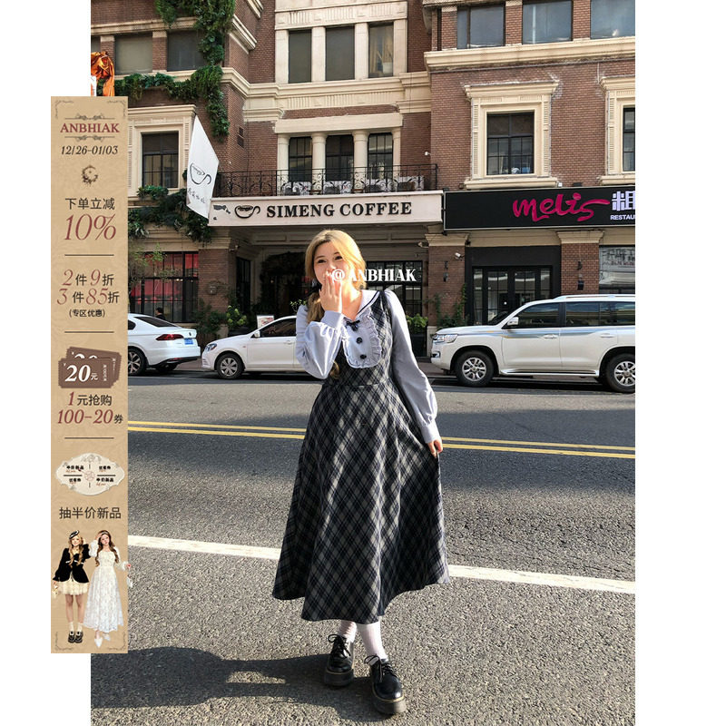 安妮不火 文艺复古海军领格纹拼接连衣裙女微胖大码假两件收腰裙
