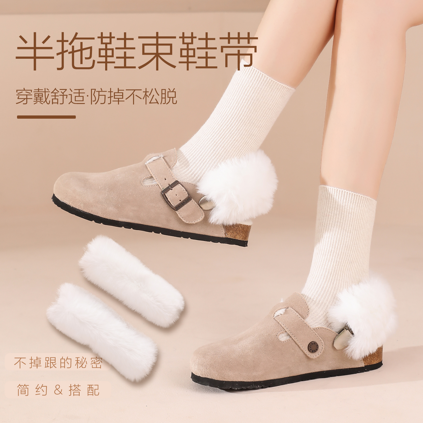 秋冬季拖鞋走路防掉带毛绒保暖后跟带配件配饰勃肯鞋半码拖束鞋带