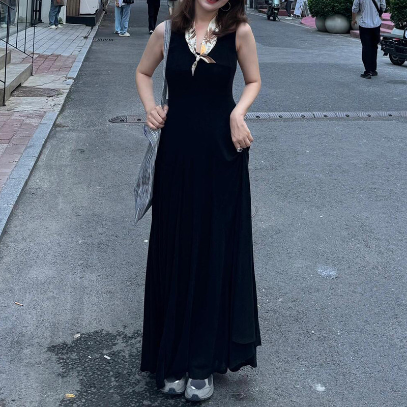 莫代尔v领气质长裙女夏季薄款睡裙修身连衣裙黑色无袖长款大摆裙