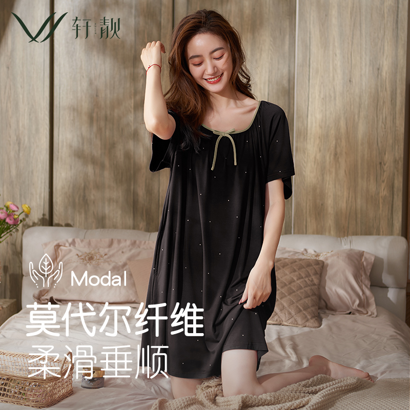 轩靓带胸垫睡裙女夏季薄款莫代尔棉短袖长裙高级感黑色睡衣家居服