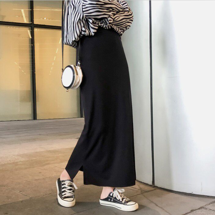 莫代尔高腰半身裙女春夏薄款侧边开叉中长裙显瘦打底裙黑色a字裙