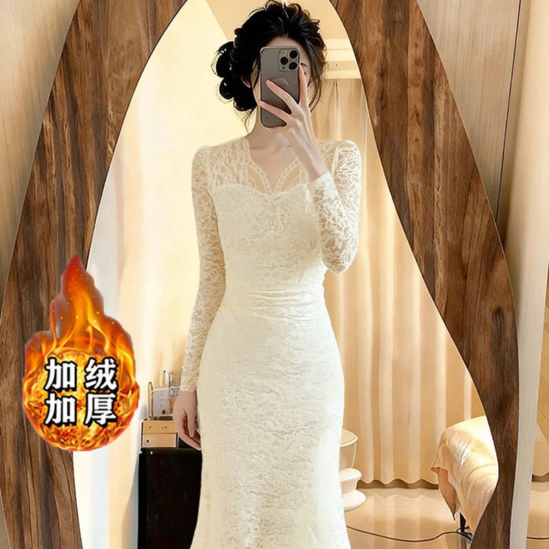 加绒加厚蕾丝连衣裙冬装新款黑色V领修身显瘦包臀鱼尾裙年会长裙