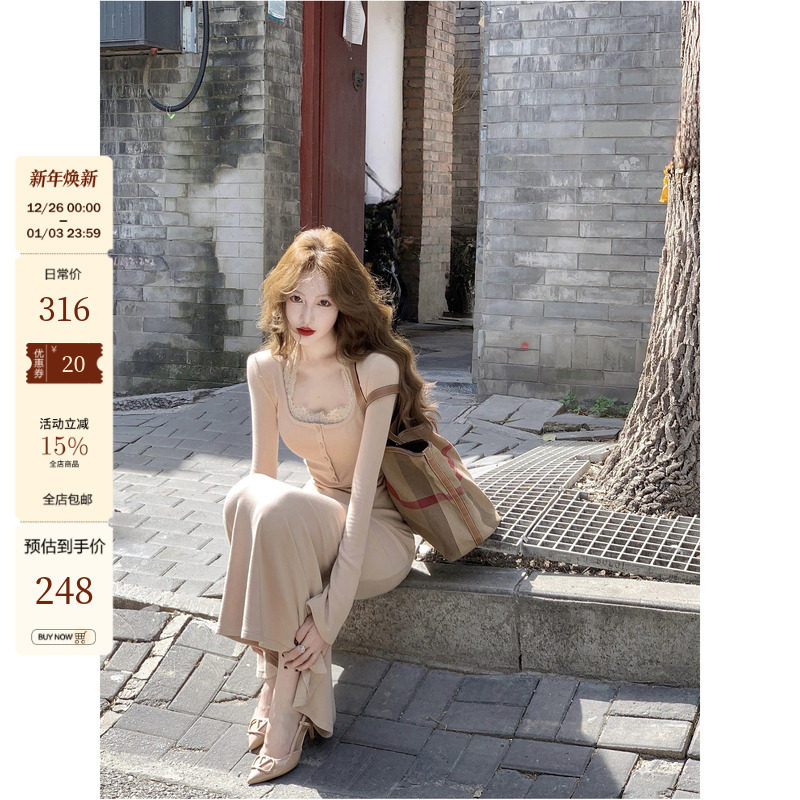 YANN M棕色秋冬弹力蕾丝鱼尾连衣裙内搭中长款法式修身款串珠系带