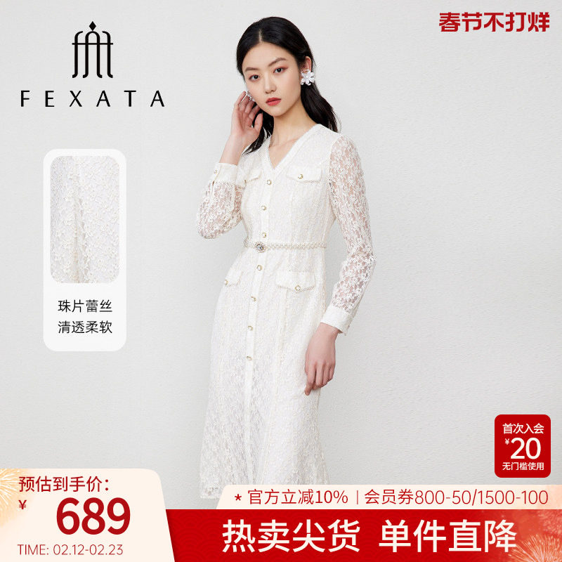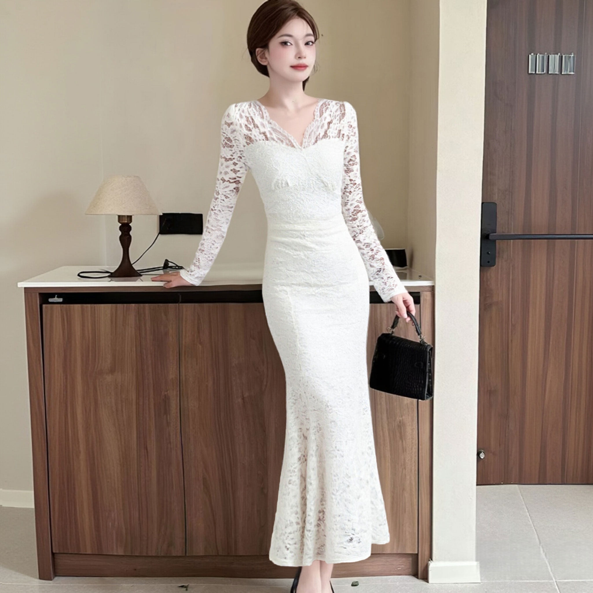 FEXATA斐格思2026春季新款V领长袖名媛气质白月光蕾丝鱼尾连衣裙