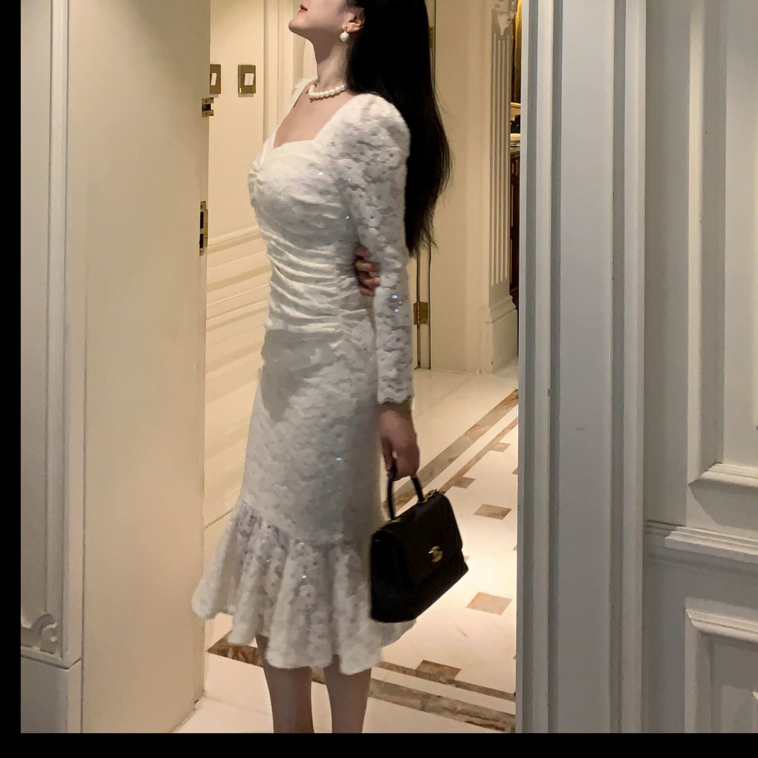 Norain不下雨 气质百搭蕾丝花边长袖鱼尾连衣裙女秋冬修身包臀裙