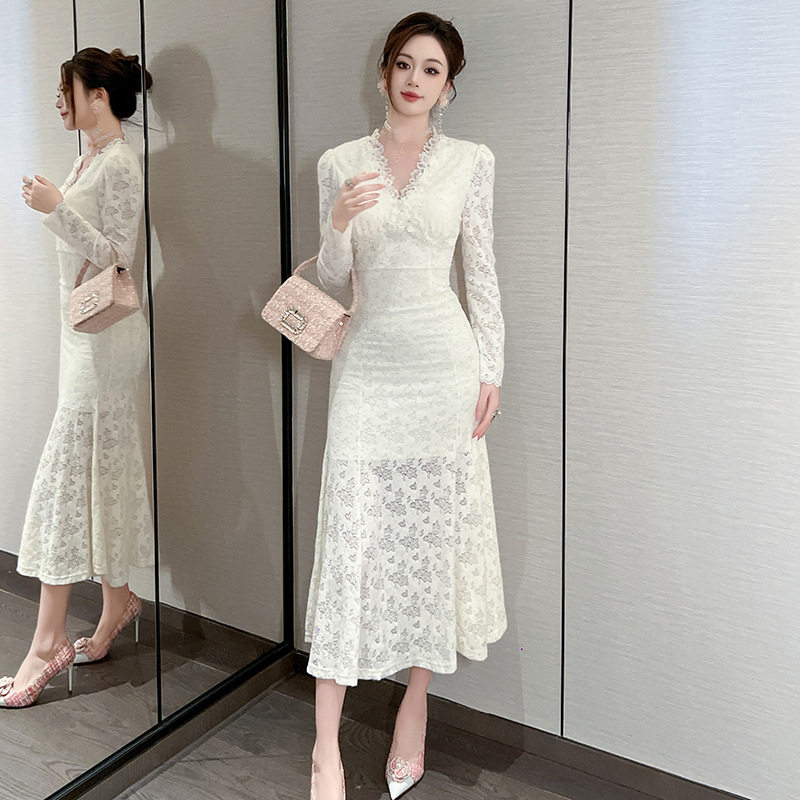 2025秋冬装新款女装优雅气质V领水溶蕾丝鱼尾连衣裙法式长裙20910