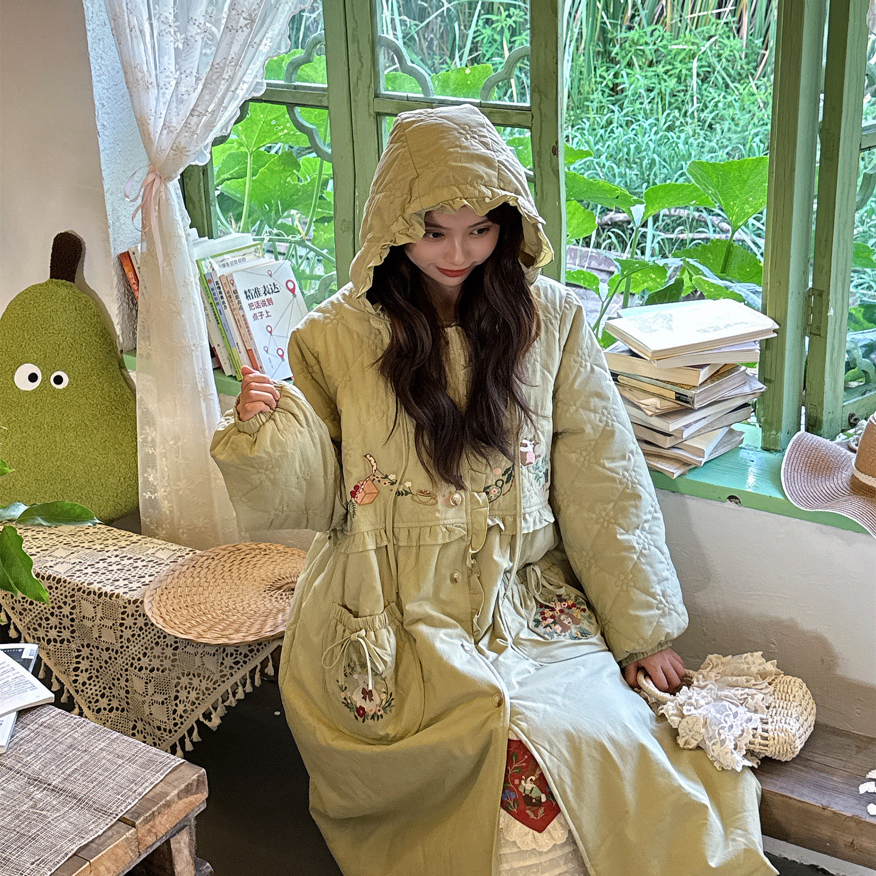 森系少女感清新绿色绣花口袋中长款保暖外套冬季连帽夹棉棉衣棉服
