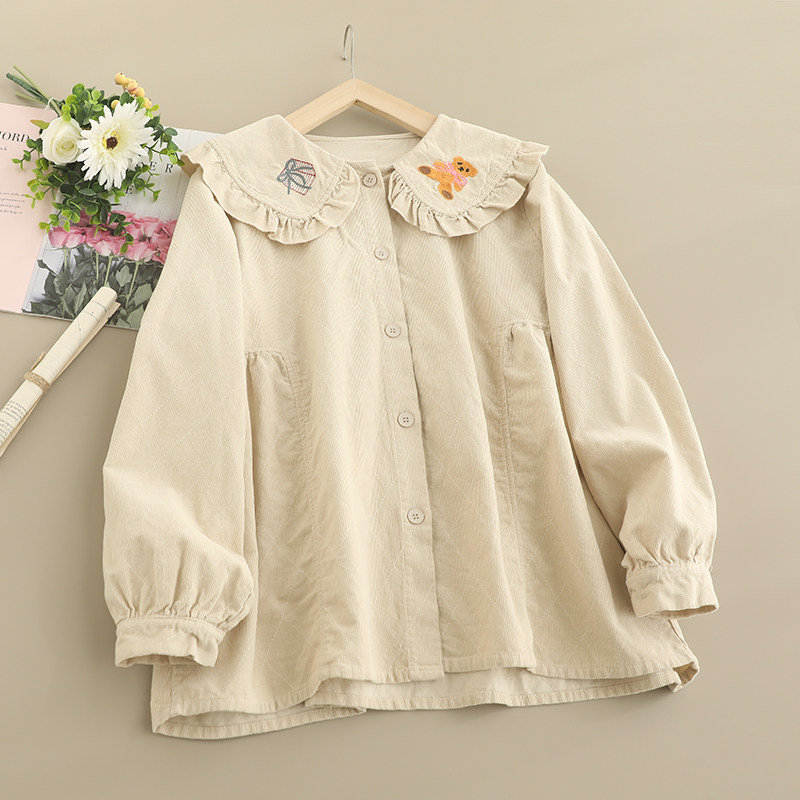 森女系重工绣花大领灯芯绒长袖衬衫女宽松大码单排扣条绒外套开衫