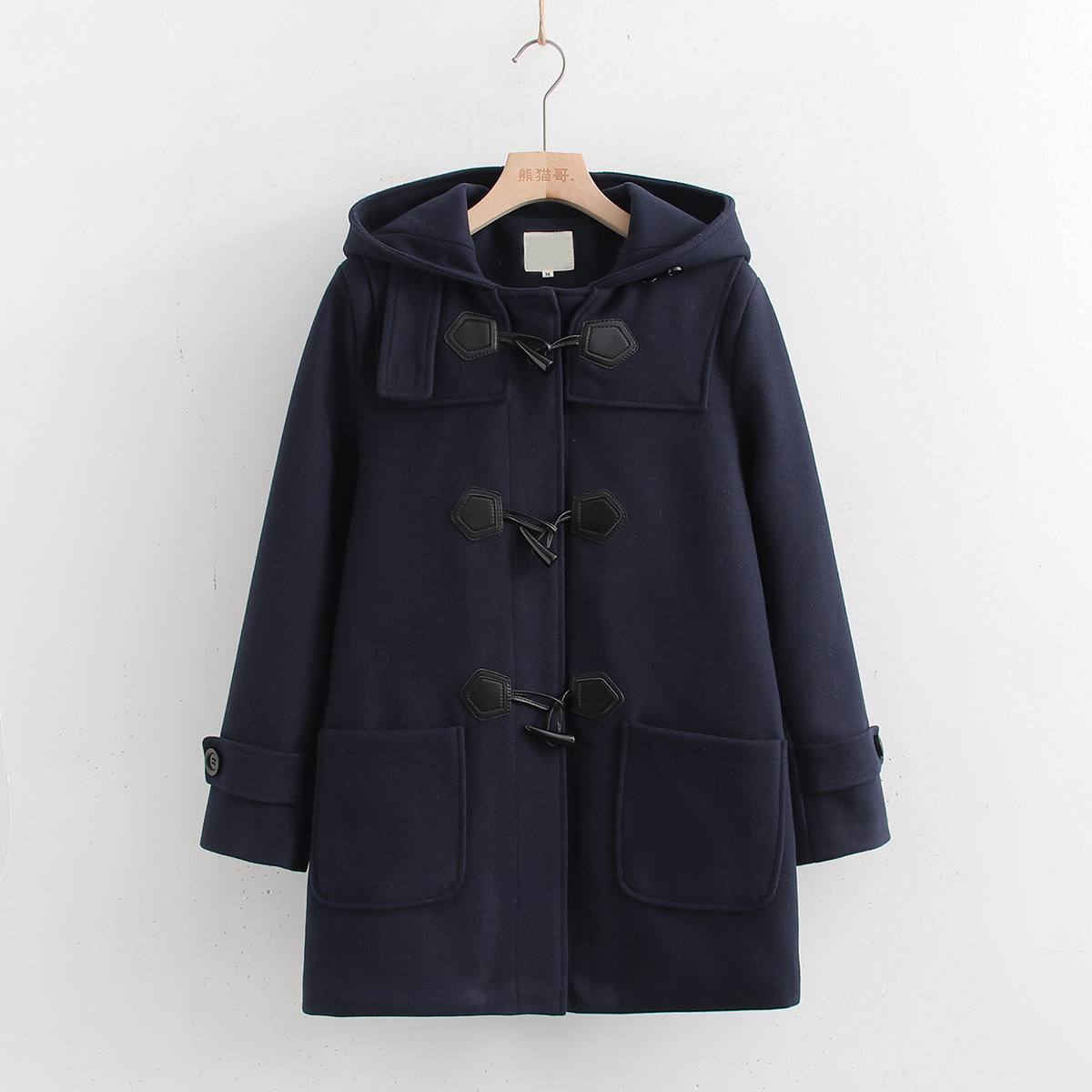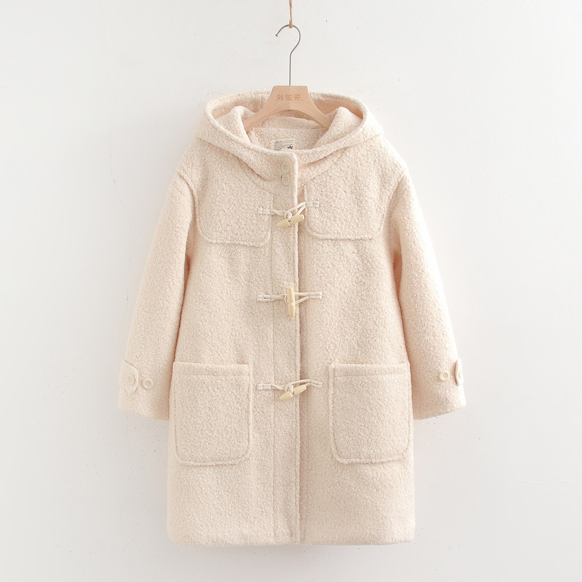 日系森女学院风冬季呢子大衣女可爱大学生牛角扣毛呢加绒加厚外套
