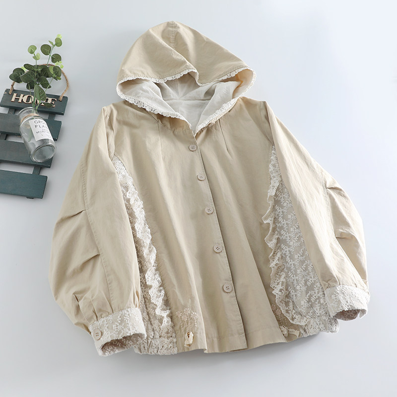 新款森女系蕾丝拼接泡泡袖连帽外套女小清新减龄休闲夹克开衫上衣