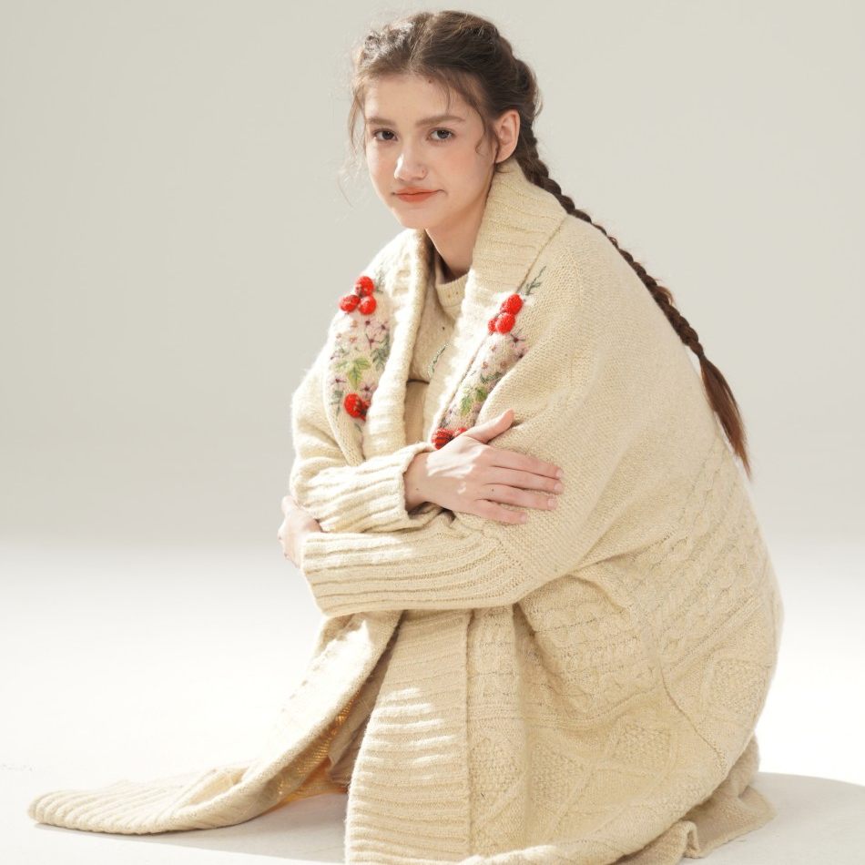 脸儿艺 手工绣花果系列 立体棒针螺纹 温暖开衫大外套 森女毛衣