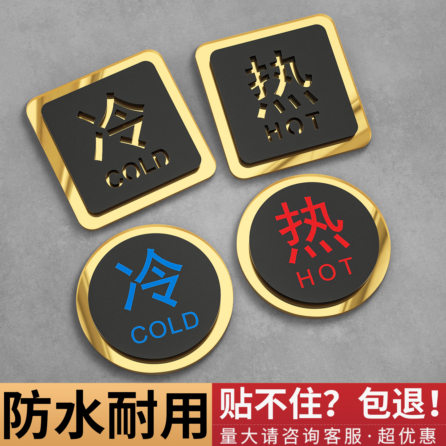 冷热水标识贴高级酒店水龙头热冷水开关提示贴纸防水定制卫生间洗手间浴室热水器冷水热水水管标志亚克力字帖