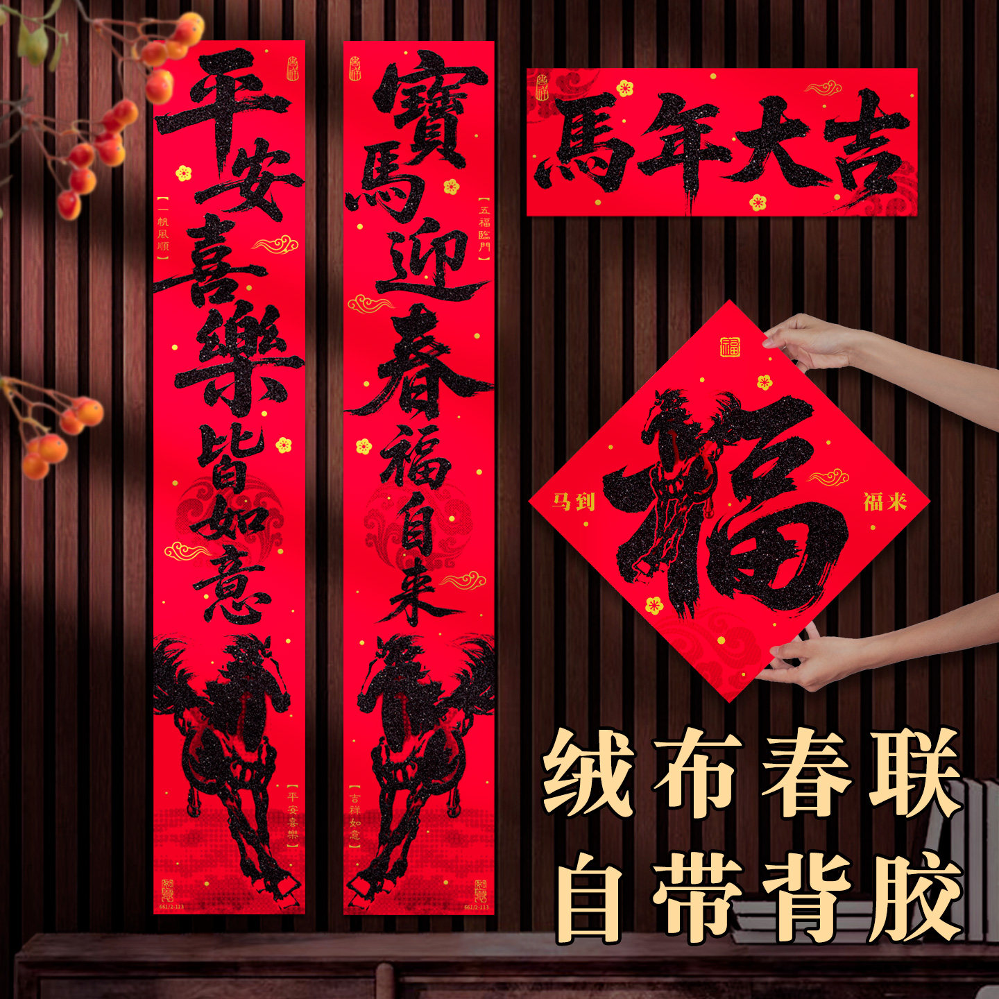 绒布对联2026马年春联新款新年过年大门创意自粘背胶黑字门贴福字