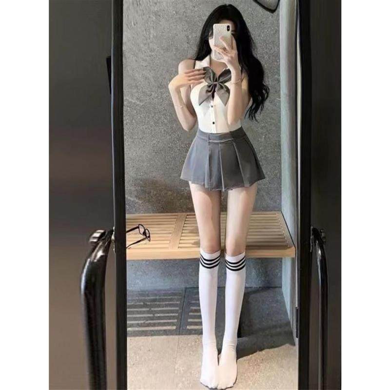 Jk校服纯性感辣妹性感套装夏季大学风格腰衬衫女士超短百褶裙两件