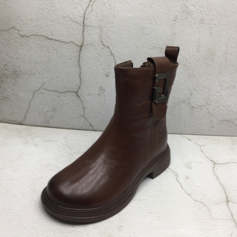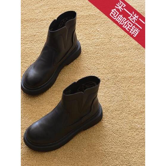 真皮靴子女短靴平跟头层牛皮马丁靴圆头一脚蹬秋冬欧美新款中筒靴