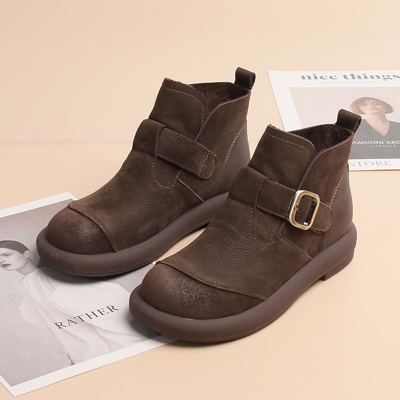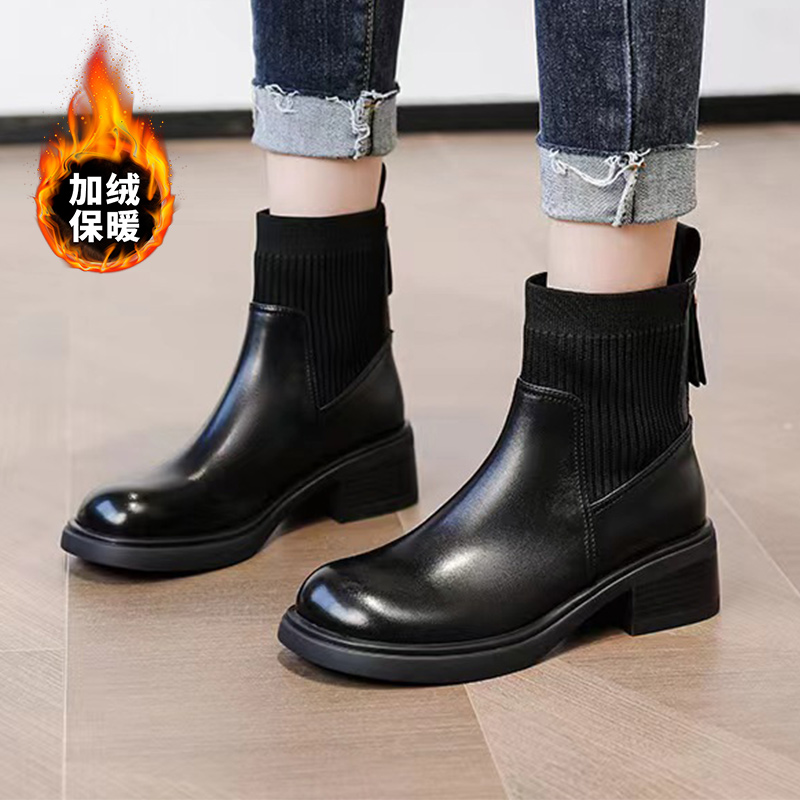 嘉俪多女鞋欧美短靴牛皮平跟冬季厚绒侧拉链保暖圆头2025新款时尚