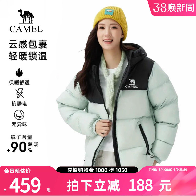 骆驼女装短款羽绒服冬季男女同款保暖加厚防风连帽面包服羽绒外套