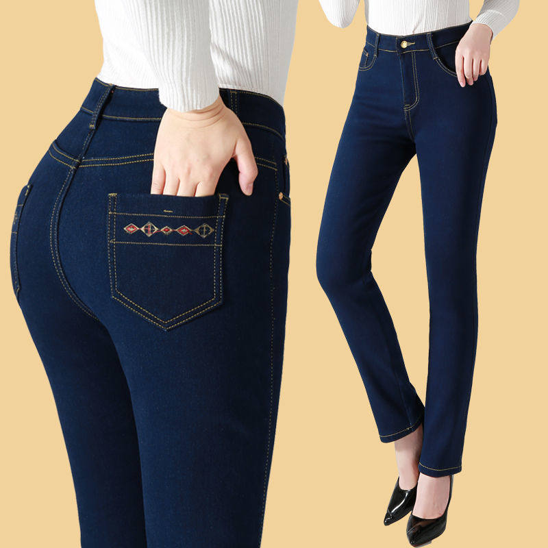 2025新款牛仔裤女加绒加厚高腰弹力中年妈妈春秋外穿铅笔裤直筒裤