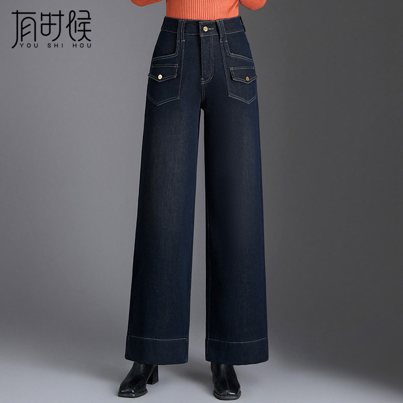 妈妈牛仔裤女秋冬加绒高腰阔腿裤时尚大码洋气宽松直筒中年女裤子