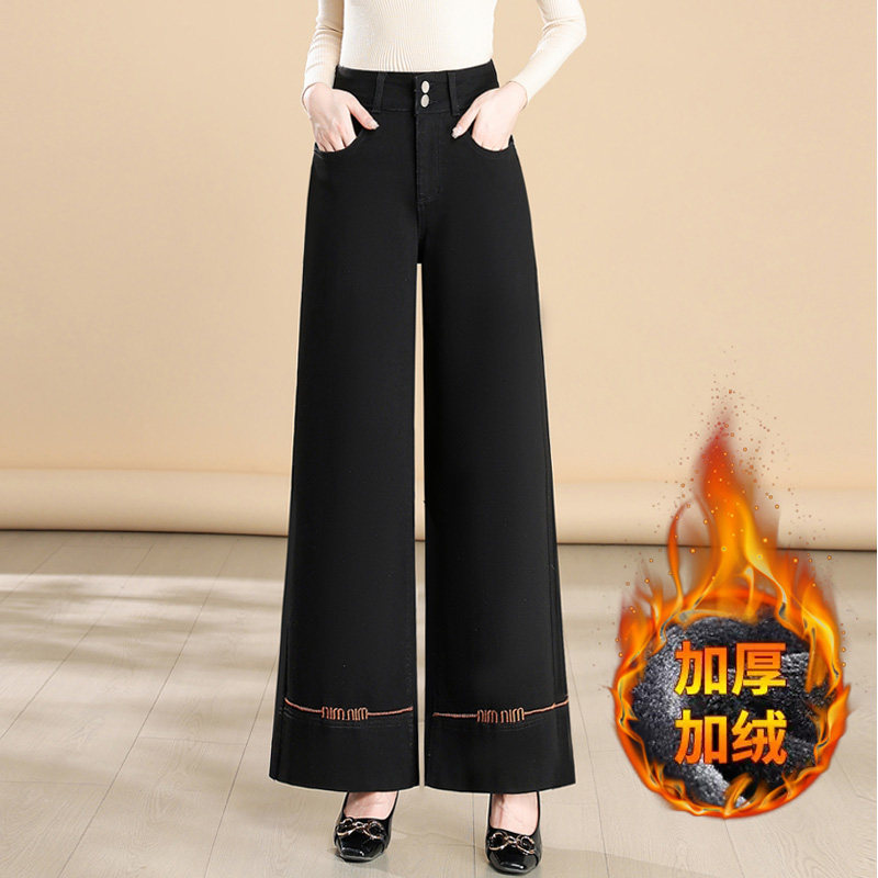直筒牛仔裤女秋冬加绒中老年妈妈高腰加厚宽松大码时尚百搭阔腿裤