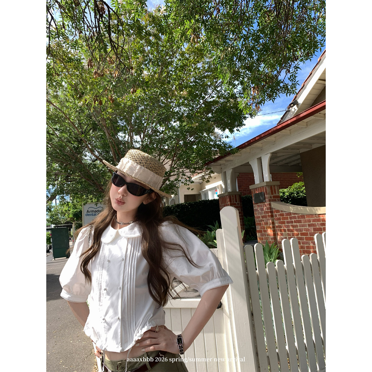 aaaaxbbb 巴拿马玫瑰 中袖娃娃领纯棉白衬衫抓襟花边泡泡袖上衣女